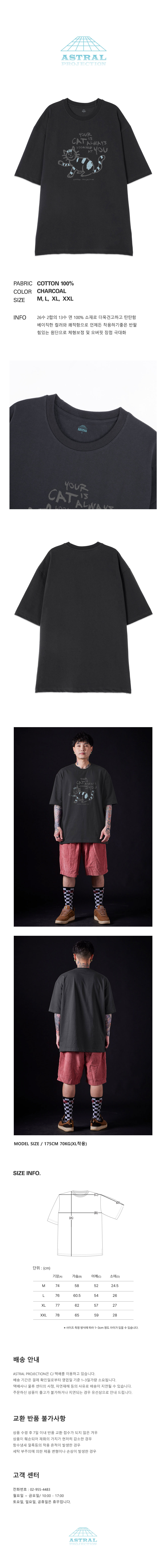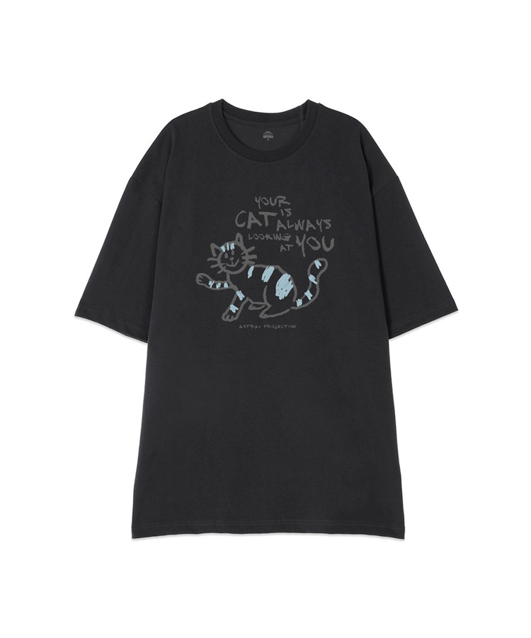 [오버핏]두들 캣 13수 면 라운드 넥 반팔 티셔츠_차콜