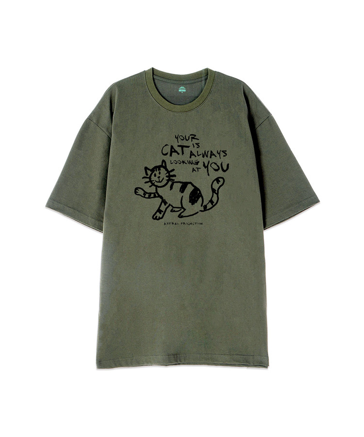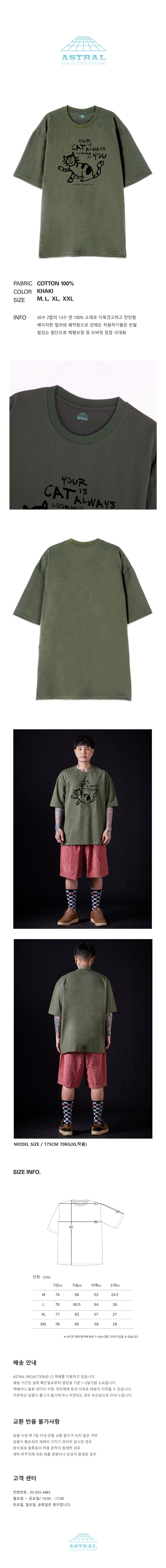 [오버핏]두들 캣 13수 면 라운드 넥 반팔 티셔츠_카키